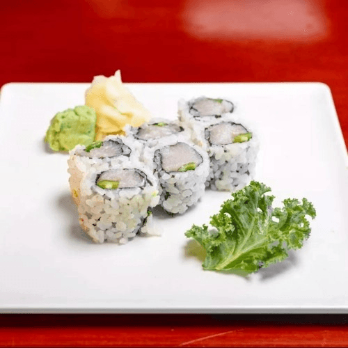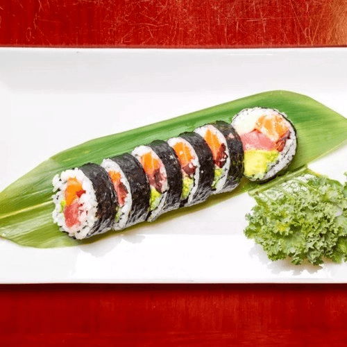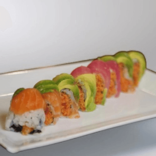 Crabmeat, cucumber, avocado. Top with tuna, salmon, and red snapper