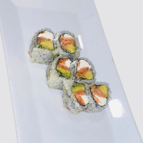 Spicy crabmeat, avocado, crunch. Top with salmon