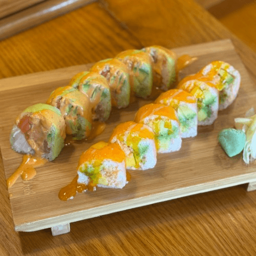 Shrimp Tempura, eel, cream cheese, and avocado wrapped with Green Soy Bean Paper. Top with Spicy mayo and eel sauce