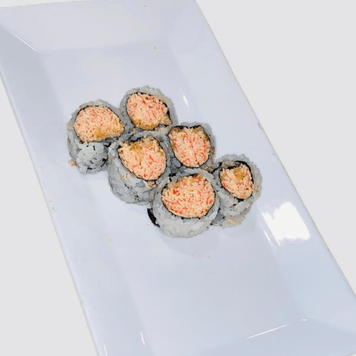 Inside tempura shrimp and spicy tuna. Top with spicy crab