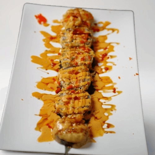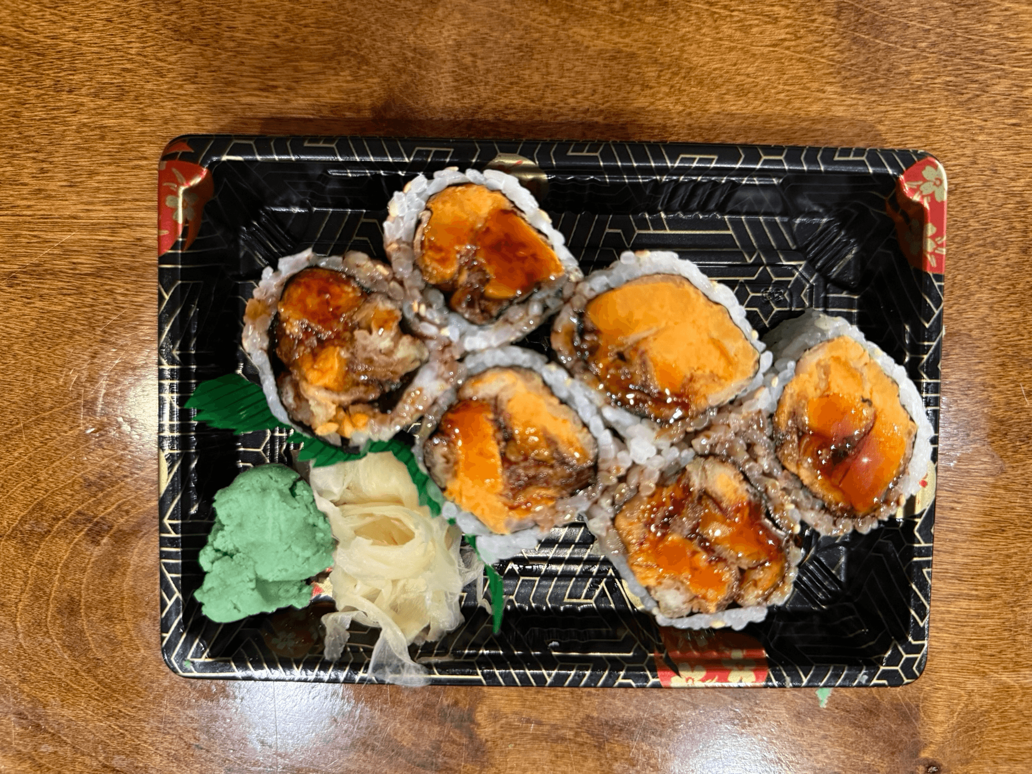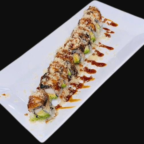 Deep Fried Style, with eel, cream cheese, avocado, and spicy crabmeat inside. Top with spicy mayo, eel sauce and tobiko.