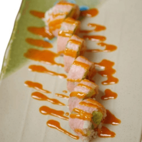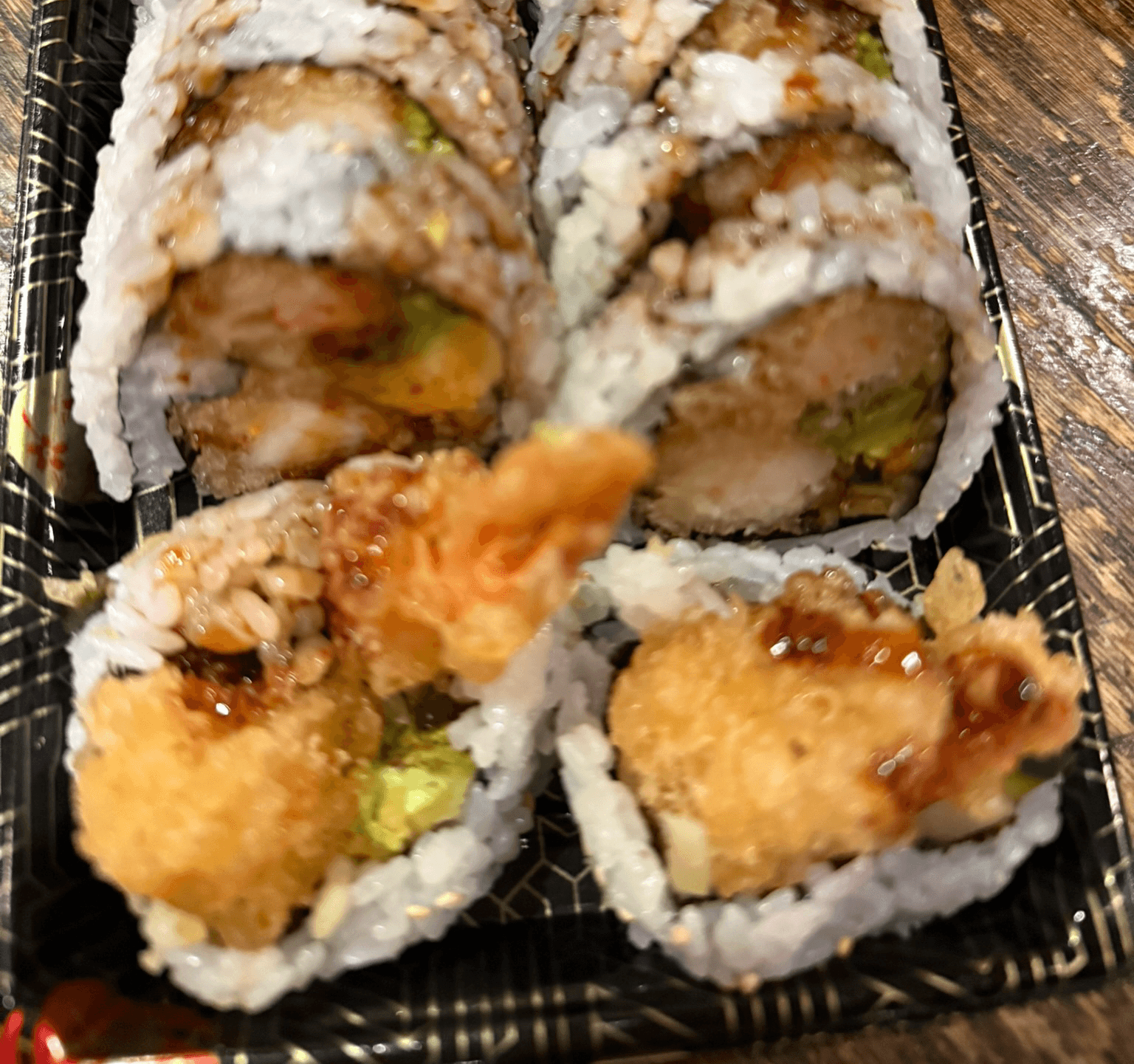 Deep-fried style with spicy tuna, and avocado. Along with spicy mayo and eel sauce on top